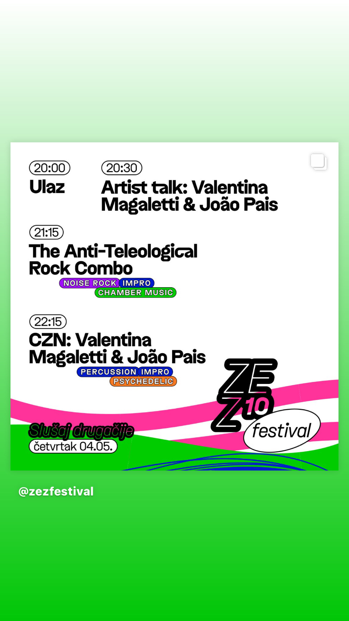 Other performance highlights include several improvised or repertoire presentations at Biennale di Venezia (Venice)Cafe Oto (London),ICA,commissioned work for Zabludowicz collection(London),The Barbican(London),Southbank Center (London),National Theatre and Dance (Lisbon),Sonoscopia (Porto),VAC(Palazzo Delle Zattere, Venice)